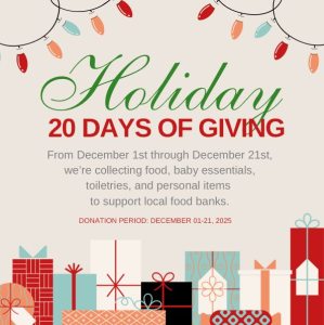 Our annual 20 Days of Giving is back—and we’re excited to make an even bigger impact this year! From December 1st through December 21st, we’re collecting food, baby essentials, toiletries, and personal items to support two incredible local food banks.